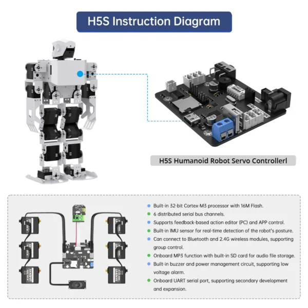 The H5S humanoid robot adopts a 16DOF structural design, making the robot more flexible. The H5S robot is equipped with intelligent high-voltage bus servos, which greatly improves the battery life. The robot controller is equipped with a built-in 32-bit high-performance CPU with 16M Flash. It not only controls bus servo movements but also supports IMU attitude detection, TTL serial communication, MP3 playback, and low voltage alarms. The H5S humanoid robot can be connected to a Bluetooth module and a 2.4G wireless module. The robot can be controlled via a mobile phone APP and supports group control. The H5S humanoid robot is equipped with a speaker with a built-in 5W stereo sound, and the volume and sound effects are better than other ordinary speakers.